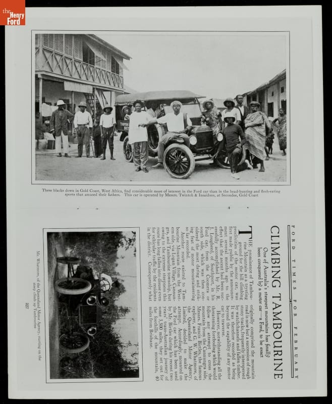 First printed in 1908, Ford Times was published by Ford Motor Company and distributed to readers free of charge. Editors often featured stories about Ford vehicles in use around the world. The February 1917 issue included photos of Fords in West Africa and Australia. The photo caption reveals racist biases and a colonial mindset toward native African inhabitants.