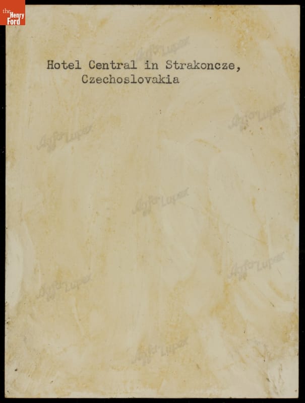 In 1913, Henry Ford established Ford Motor Company's photographic department. Though few internal records describe company photography, remaining photographs reveal a wide range of departmental activity. Over nearly 100 years, Ford photographers documented company ventures, personal affairs, and daily life around the world. This photograph shows automobiles and people near a Czechoslovakian hotel.