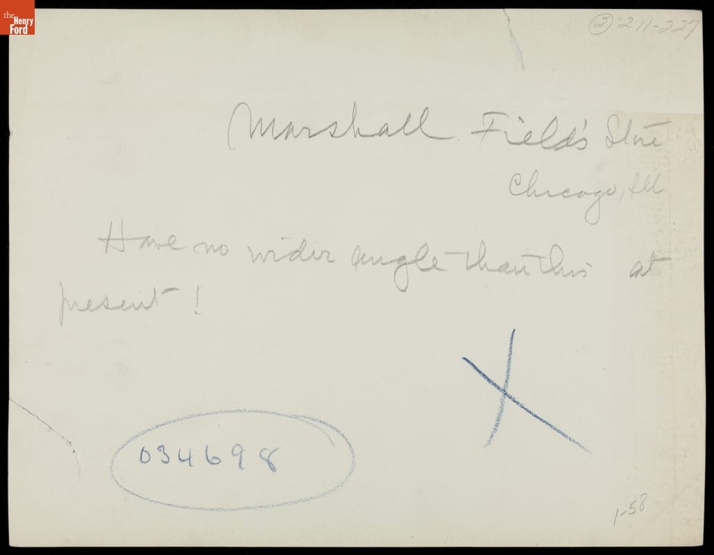 From 1895 to 1924, the Detroit Publishing Company was one of the world's chief image publishers. The company had a wide-ranging stock of original photographs--including this image showing streetcars, horse-drawn vehicles, early automobiles, and pedestrians in front of Chicago's Marshall Field's. Throughout the 20th century, this famous department store grew to become a major national chain.