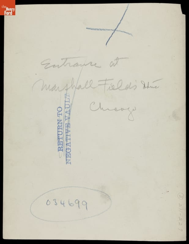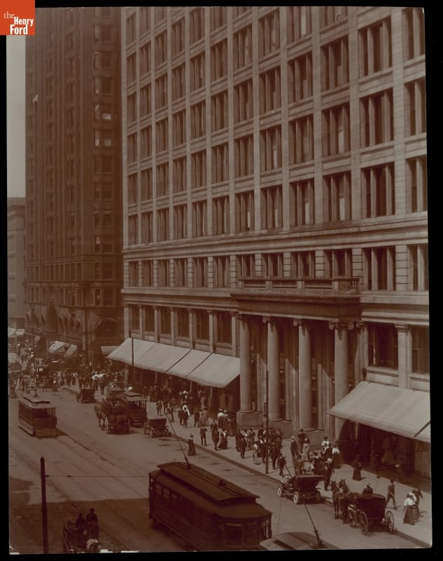 From 1895 to 1924, the Detroit Publishing Company was one of the world's chief image publishers. The company had a wide-ranging stock of original photographs--including this image showing streetcars, horse-drawn vehicles, early automobiles, and pedestrians in front of Chicago's Marshall Field's. Throughout the 20th century, this famous department store grew to become a major national chain.