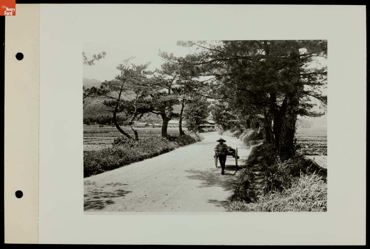 In 1913, Henry Ford established Ford Motor Company's photographic department. Though few internal records describe company photography, remaining photographs reveal a wide range of departmental activity. Over nearly 100 years, Ford photographers documented company ventures, personal affairs, and daily life around the world. This man was photographed pulling a rickshaw along a packed dirt road in Asia.