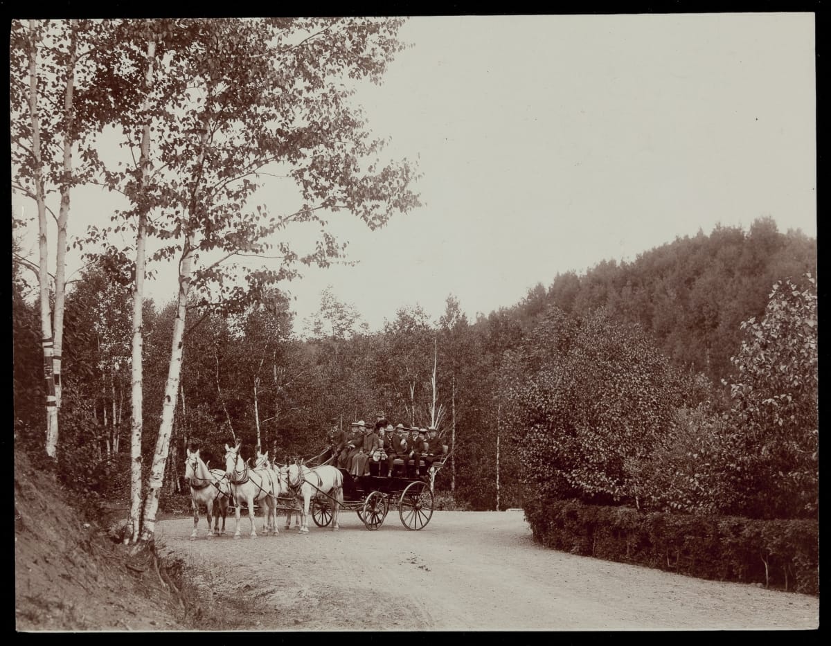 Vacationing Americans at the turn of the twentieth century often set aside time to simply look at things -- stagecoach sightseeing excursions transported tourists into new settings, where they could transcend the commonplace realities of life back home. This coaching party surveyed the scenery near Duluth, Minnesota, around 1905.