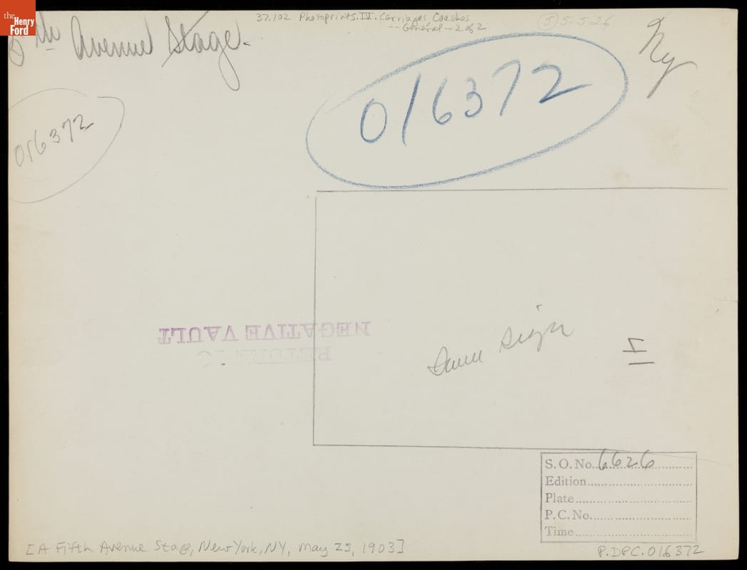 Fifth Avenue residents opposed streetcar lines, claiming the vehicles were too quick and quiet to safely share the street with pedestrians and horse-drawn traffic. As an alternative, the Fifth Avenue Coach Company ran omnibuses like the one in this Detroit Publishing Company photograph. The fleet was replaced by gasoline-driven motor coaches in 1907.