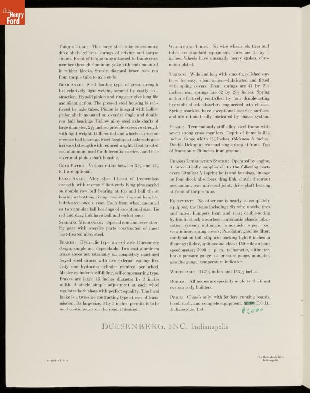 By Hollenbeck Press for Duesenberg, Inc., both of Indianapolis, Indiana.