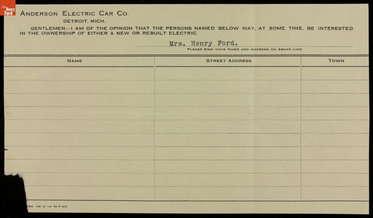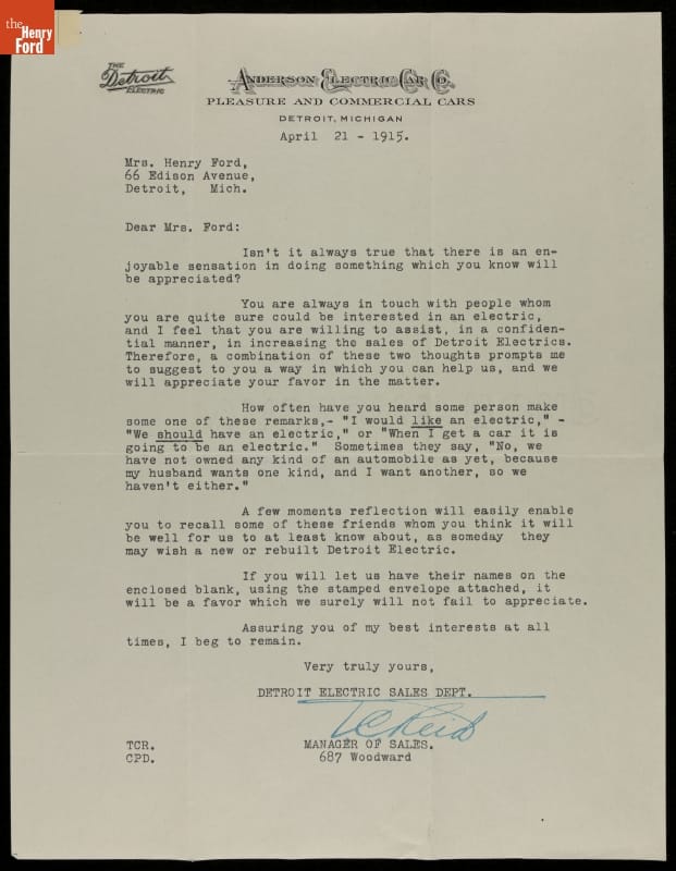 Surprisingly, Clara Ford -- wife of Henry Ford -- drove an electric car instead of a Ford Model T. Early electrics were often marketed to women because of the cars' cleanliness and ease of operation. Anderson Electric, maker of Mrs. Ford's car, sent this letter hoping she might suggest a few friends interested in buying an electric vehicle.