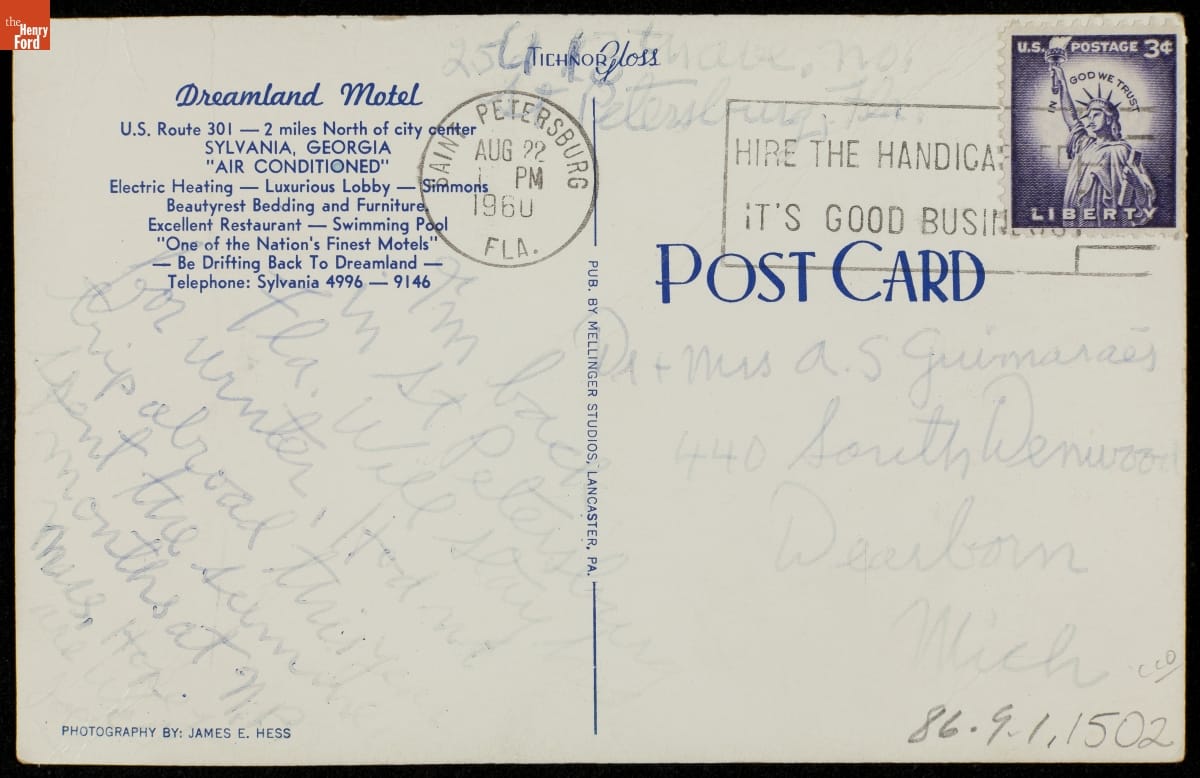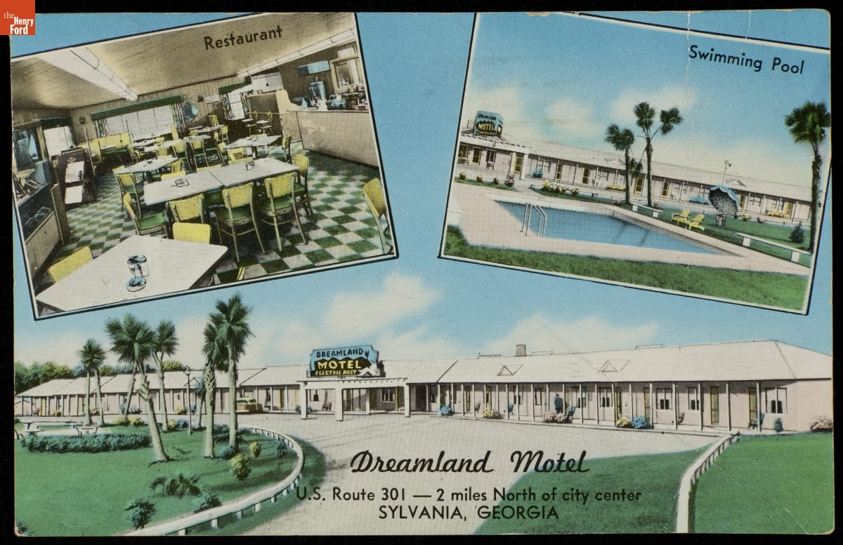 A motel postcard was usually a free souvenir for guests, but it also served as advertisement for the owner. This postcard shows the Dreamland Motel and its amenities -- a pool and restaurant. A patron sent this postcard to friends in Dearborn, Michigan. Perhaps these friends -- the motel owner hoped -- would stop and stay when they passed through on their way to Florida.