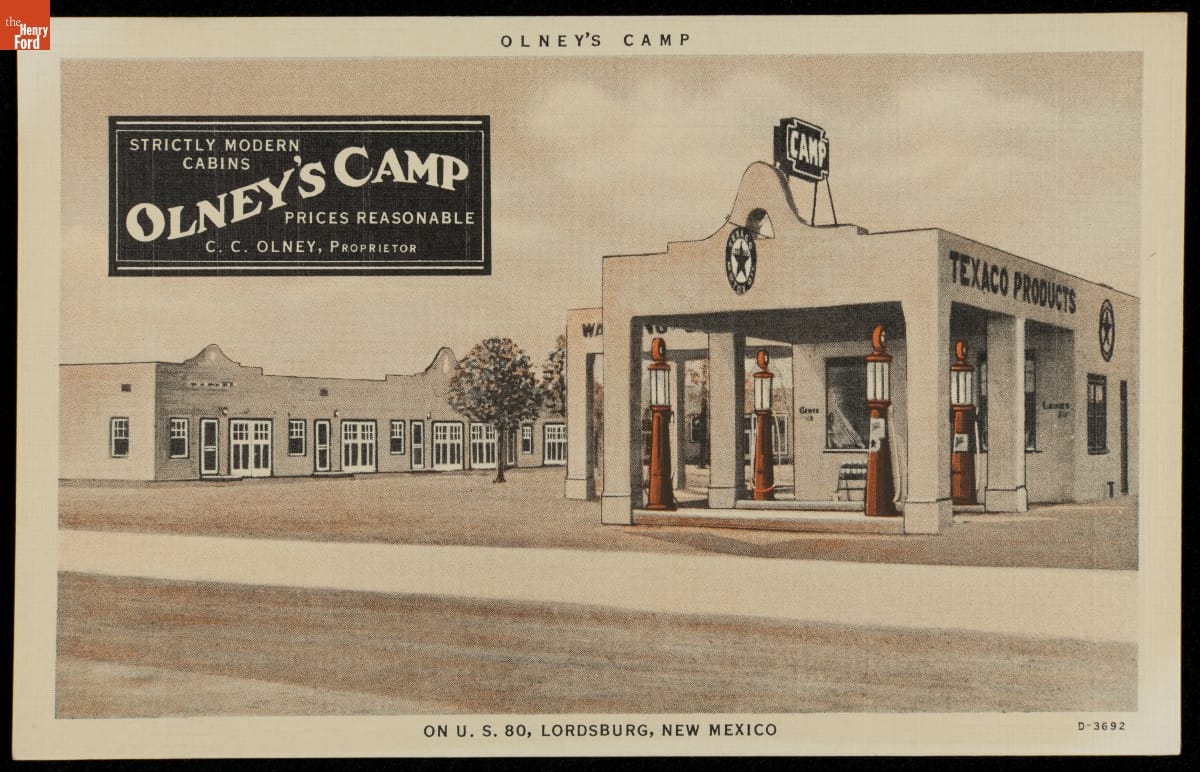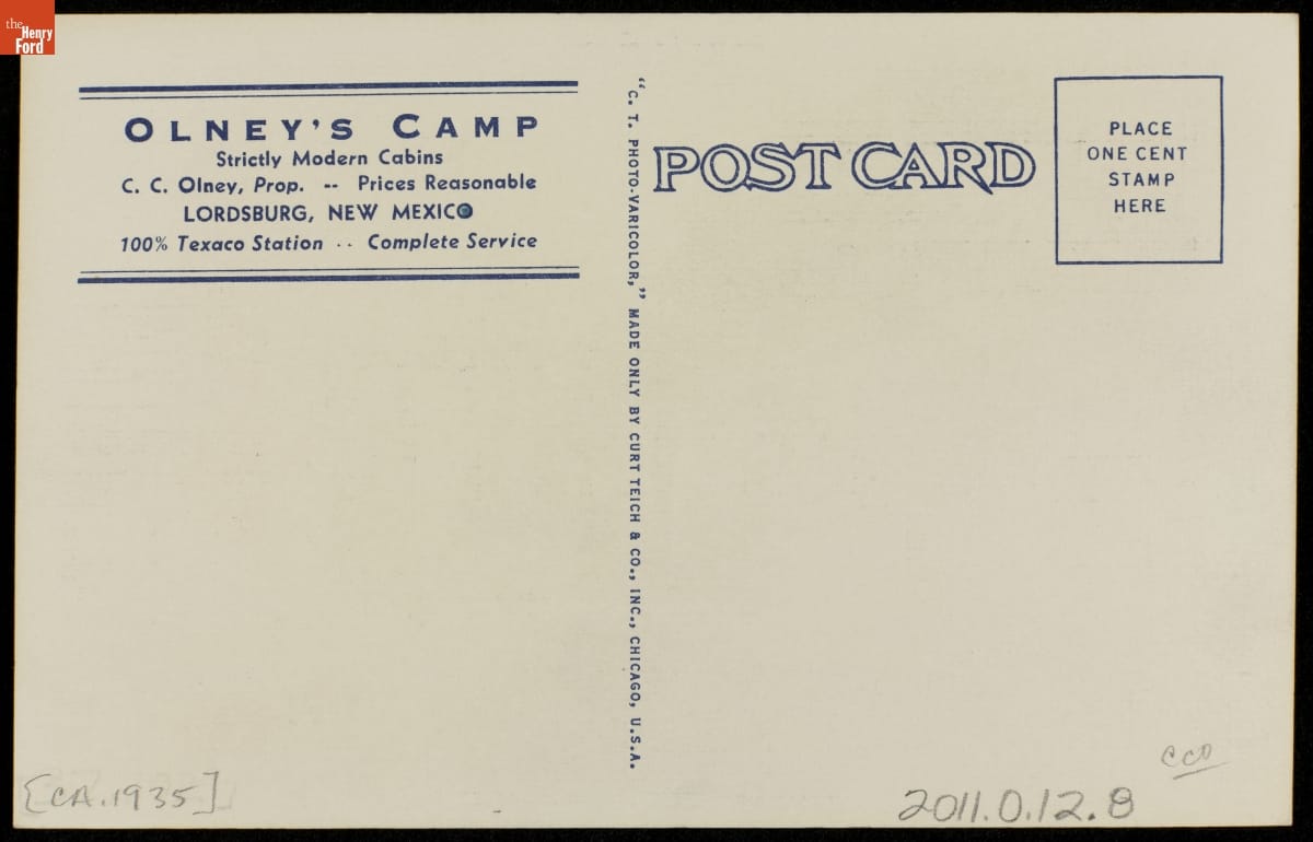 The Texaco gas station was the focus of this postcard for Olney's Camp in Lordsburg, New Mexico. C.C. Olney, the proprietor, promised "reasonable prices" for a stay in his "strictly modern cabins." The cabins were connected to each other by garages for car parking. The architecture of Olney's Camp was Pueblo Revival, a popular style in the Southwest.