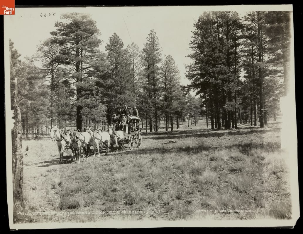 Few places seemed more romantic than the American West to tourists at the turn of the 20th century. Many headed westward, seeking the untamed beauty and vast open spaces that epitomized opportunity, individuality, and what it meant to be American. Here, passengers view the natural landscape from inside or atop a sightseeing carriage on its way to Arizona's Grand Canyon.