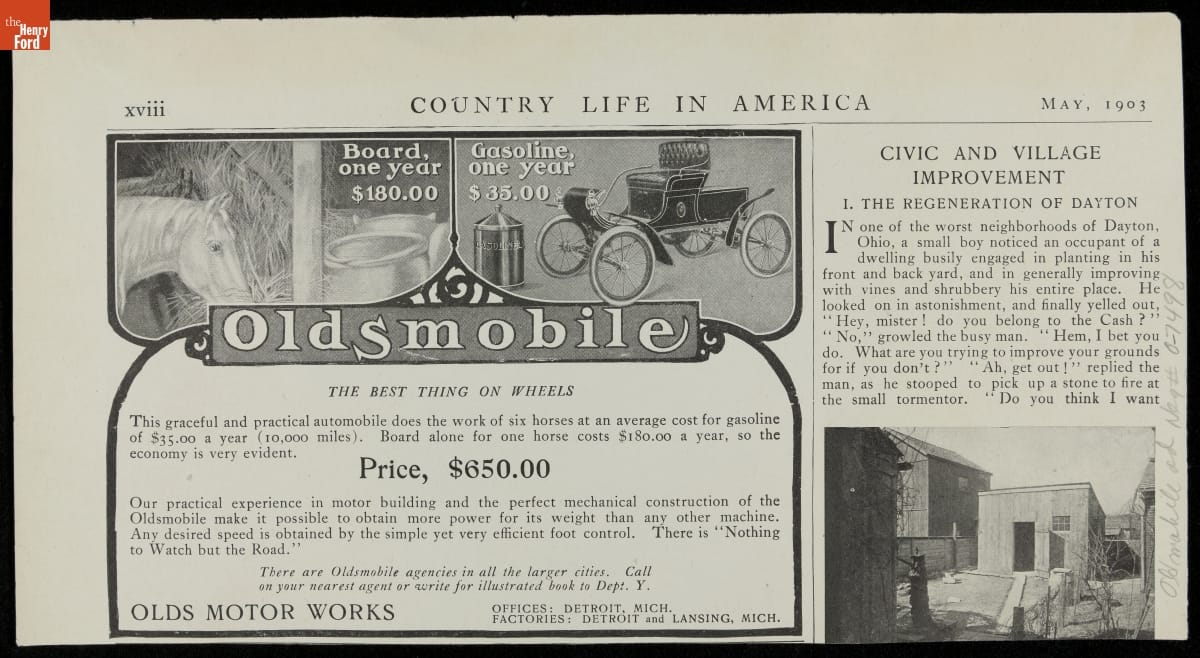 Many would-be customers balked at the high price of an automobile. Oldsmobile offered a popular counterargument in this 1903 advertisement. The car required $35 in gasoline for a year of operation, while a horse needed $180 in food. What's more, the car only used gas when it ran, while a horse had to be fed whether it worked or not.