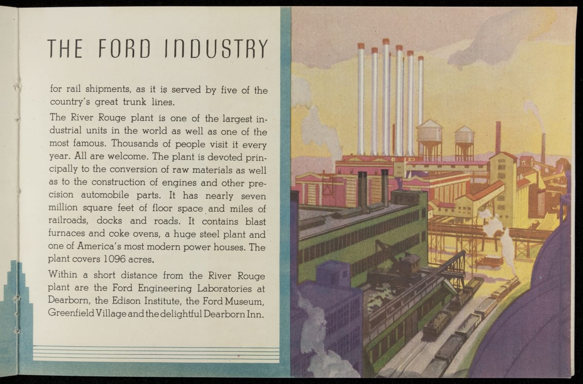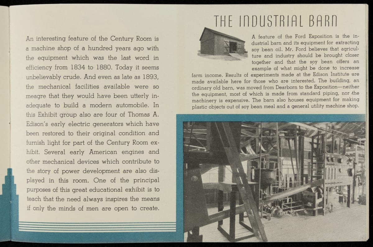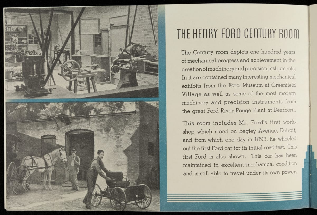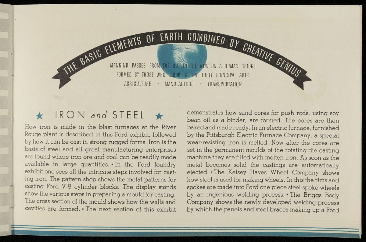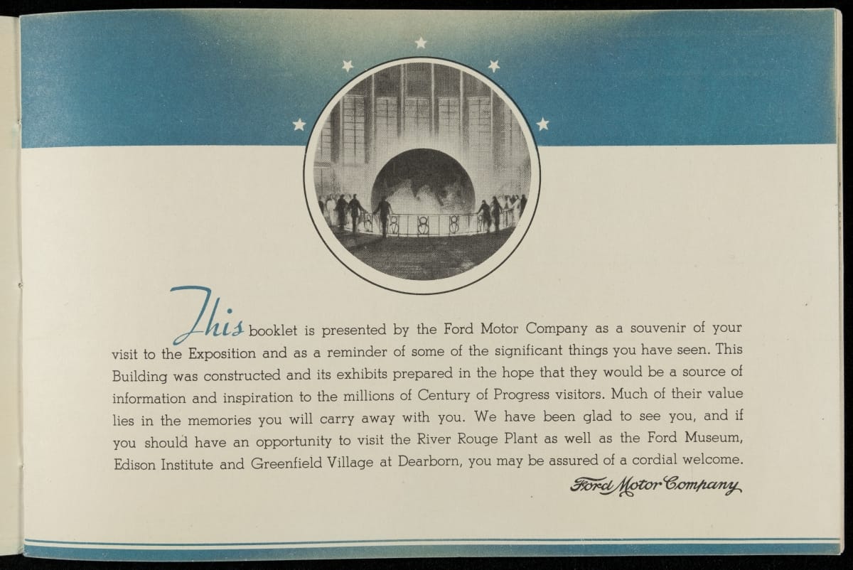 Chicago's 1933-34 Century of Progress Exposition used the theme of progress to encourage optimism during the Depression. The 11-acre Ford Motor Company exposition became the most talked-about exhibit of 1934, featuring a variety of industrial demonstrations and informative displays. Ford produced this booklet as a souvenir for fairgoers who visited the Ford Building.