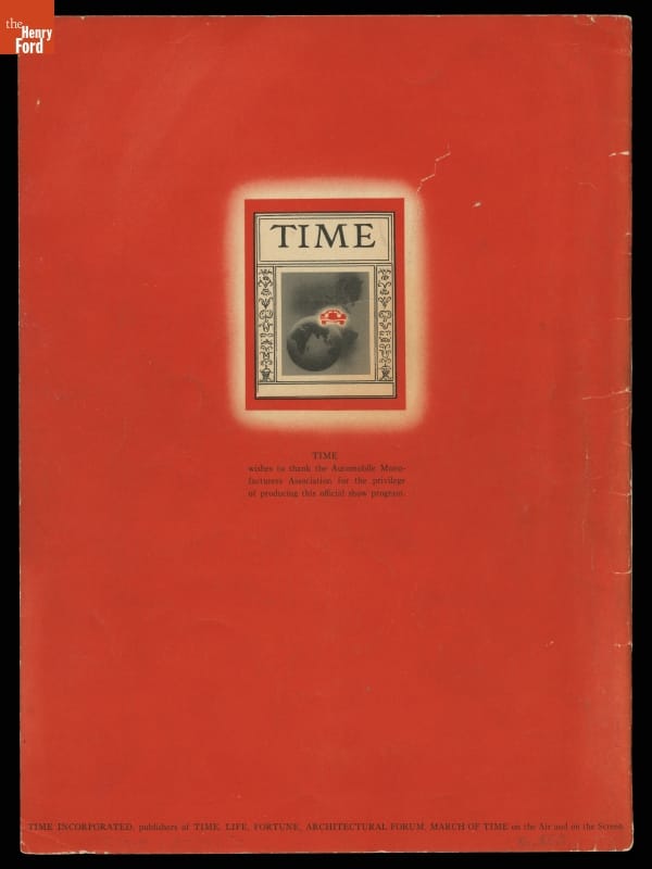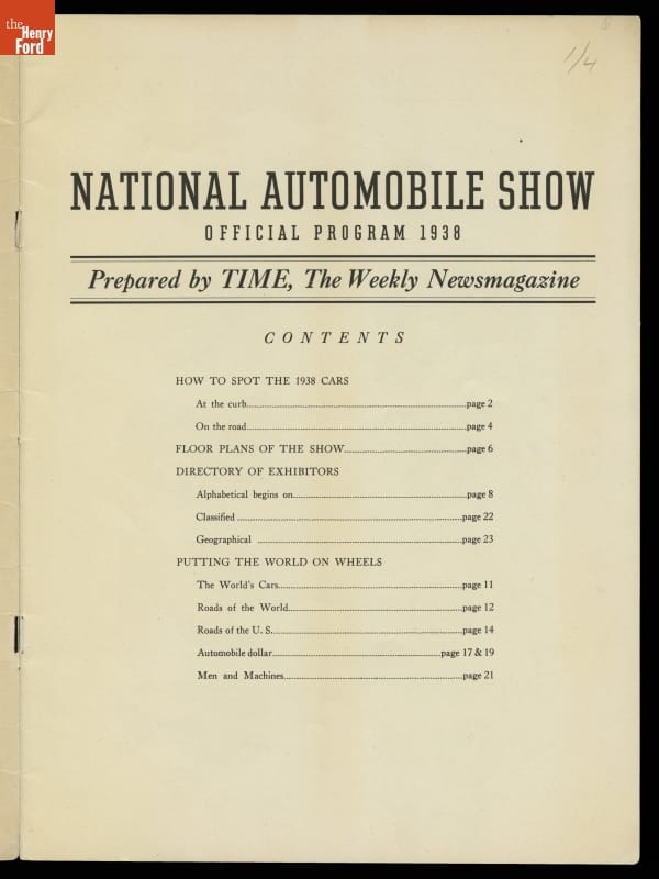 First staged in 1900, the New York Auto Show is considered the first major all-automobile show in the United States. It remains one of the world's largest and most important. This 1937 program highlights that year's show theme: "Putting the World on Wheels." The program includes a "spotter's guide" showing the major manufacturers' 1938 models.