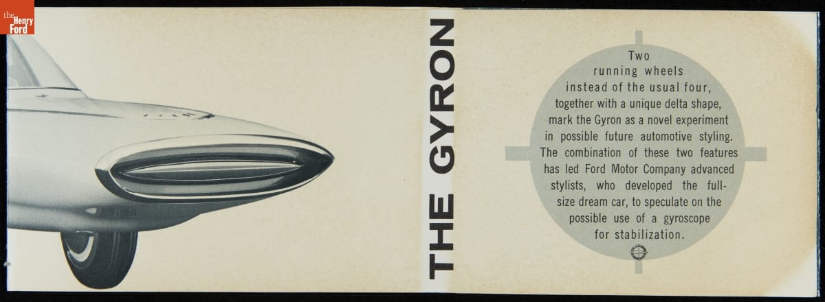 Ford Motor Company revealed its Gyron concept car in 1961. Designers intended for a gyroscope to keep the two-wheeled car upright, but the technology was too expensive for a show car. Instead, the fiberglass Gyron used outrigger wheels to keep its balance while an electric motor moved it at 5 mph. The Gyron was destroyed in the 1962 Ford Rotunda fire.