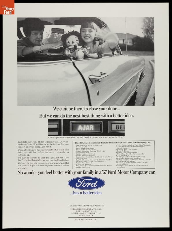 For years it was a common belief among automakers that "safety didn't sell." Customers were more interested in performance and comfort than protection. In the 1960s, attitudes were changing. This 1967 ad from Ford promotes a warning light that alerts drivers when a car door isn't closed. It was one of several features designed to keep the vehicle's occupants safe.