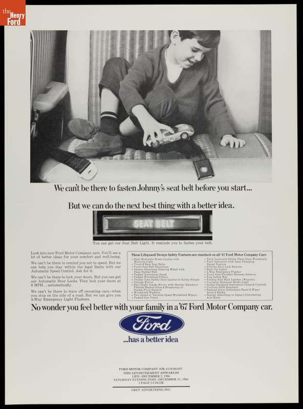 For years it was a common belief among automakers that safety didn't sell. Customers were more interested in performance and comfort than protection. In the 1960s, attitudes were changing. This 1967 ad from Ford promoted a warning light that alerted drivers when a seat belt wasn't buckled. It was one of several features designed to keep the vehicle's occupants safe.
