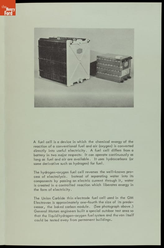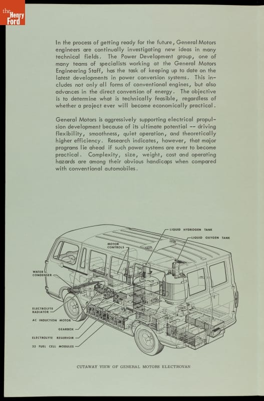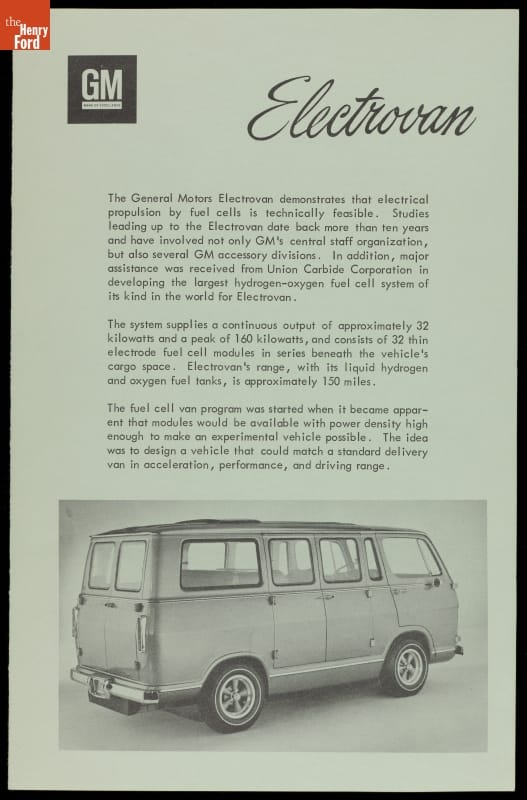 General Motors revealed its Electrovan to the press and public in 1966. It was the world's first vehicle powered by hydrogen fuel cells. The chemical reaction between hydrogen fuel and oxygen produced electricity to operate the van's motor. The only byproducts were water and heat. But the equipment of the time was large, expensive, and too dangerous for everyday use.