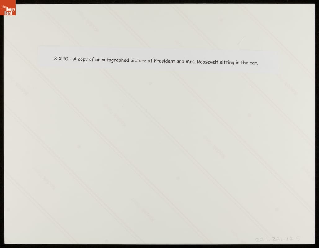 Caption typed on separate paper affixed to back of photograph: A copy of an autographed picture of President and Mrs. Roosevelt sitting in the car. Handwritten: Franklin D. Roosevelt, Eleanor Roosevelt