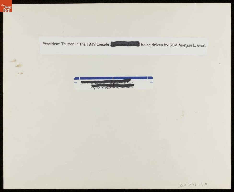 United States Secret Service agent Morgan L. Gies was responsible for White House vehicles from 1941 to 1967, serving five presidents. This photograph from his personal collection shows President Harry S. Truman (wearing a white hat) in the back seat of a 1939 Lincoln presidential limousine around 1949.