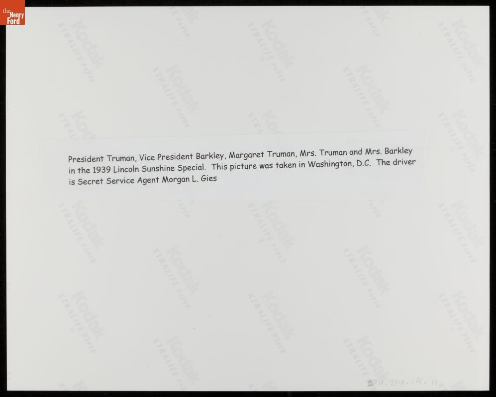 United States Secret Service agent Morgan L. Gies was responsible for White House vehicles from 1941 to 1967, serving five presidents. This photograph from his personal collection shows Gies driving in a Washington, D.C., parade. Passengers in the 1939 Lincoln presidential "Sunshine Special" include President and First Lady Truman, Vice President and Mrs. Barkley, and the president's daughter Margaret.
