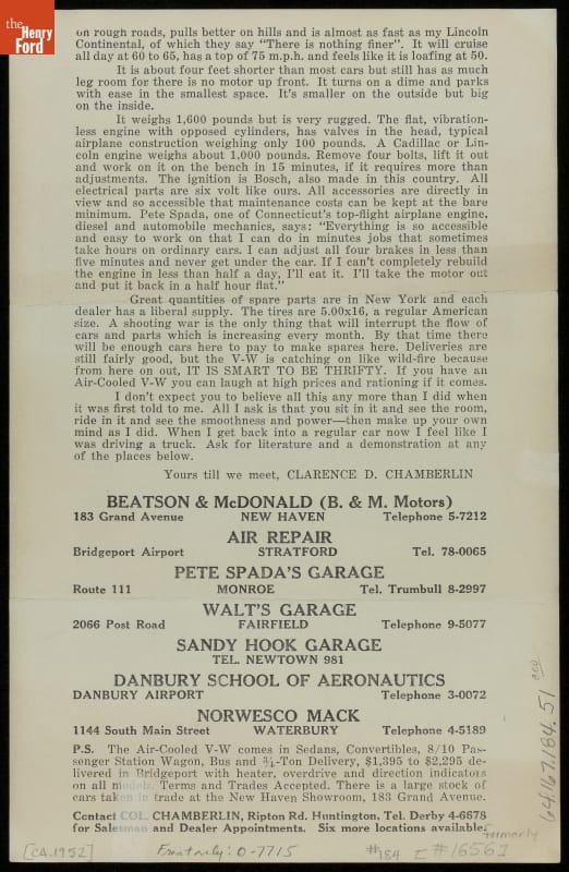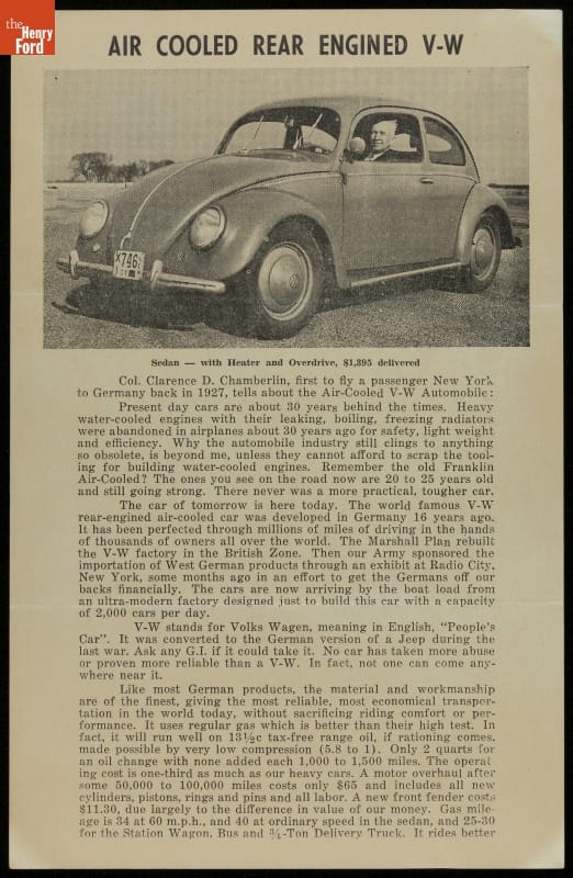 "Air Cooled Rear Engined V-W Sedan with Heater and Overdrive" Volkswagen Advertisement, circa 1952