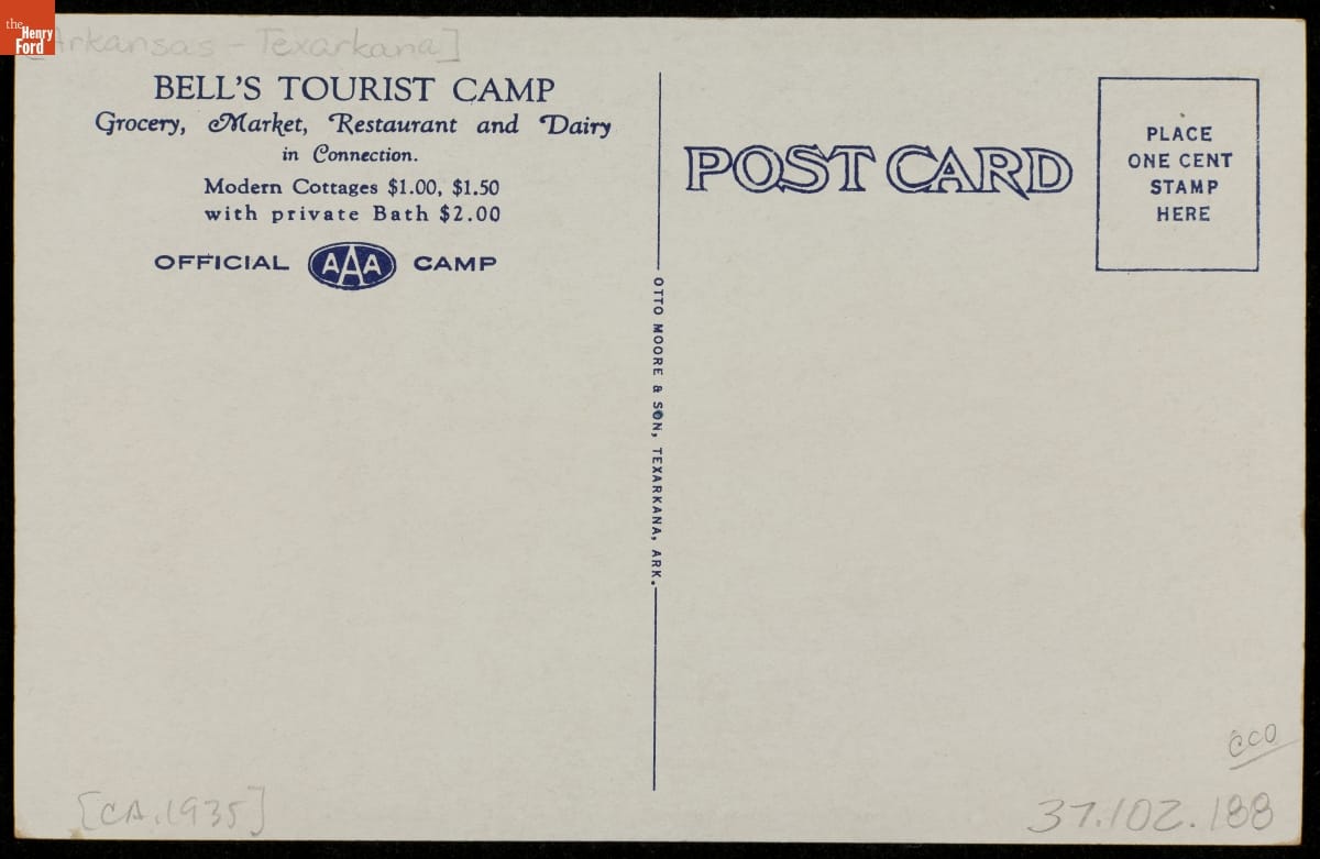Motorists weary of roughing it in tents found that homey little cabins offered a convenient, economical alternative. By the 1930s, tourist cabins were popping up everywhere. Bell's Tourist Camp in Texarkana, Arkansas, offered a selection of "modern cottages," along with a restaurant and market.