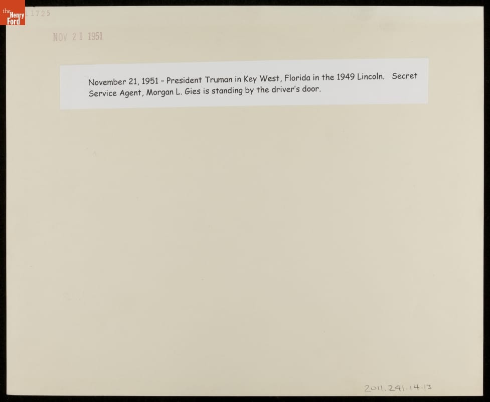 United States Secret Service agent Morgan L. Gies was responsible for White House vehicles from 1941 to 1967, serving five presidents. This photograph from his personal collection shows President Harry S. Truman on vacation in Key West, Florida. Agent Gies stands by the driver's door of Truman's presidential convertible, a 1949 Lincoln Cosmopolitan.