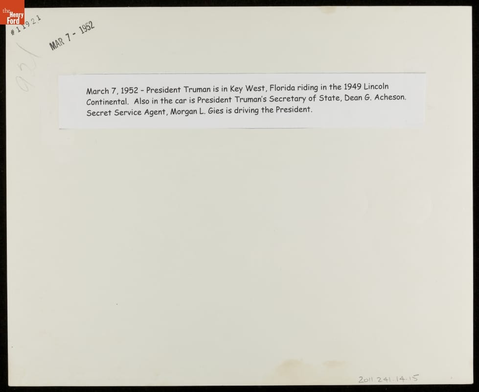 United States Secret Service agent Morgan L. Gies was responsible for White House vehicles from 1941 to 1967, serving five presidents. This photograph from his personal collection shows Gies behind the wheel of a 1949 Lincoln Cosmopolitan. His passengers are Captain Cecil C. Adell, Admiral William Leahy, Secretary of State Dean Acheson, and President Harry S. Truman (wearing glasses).
