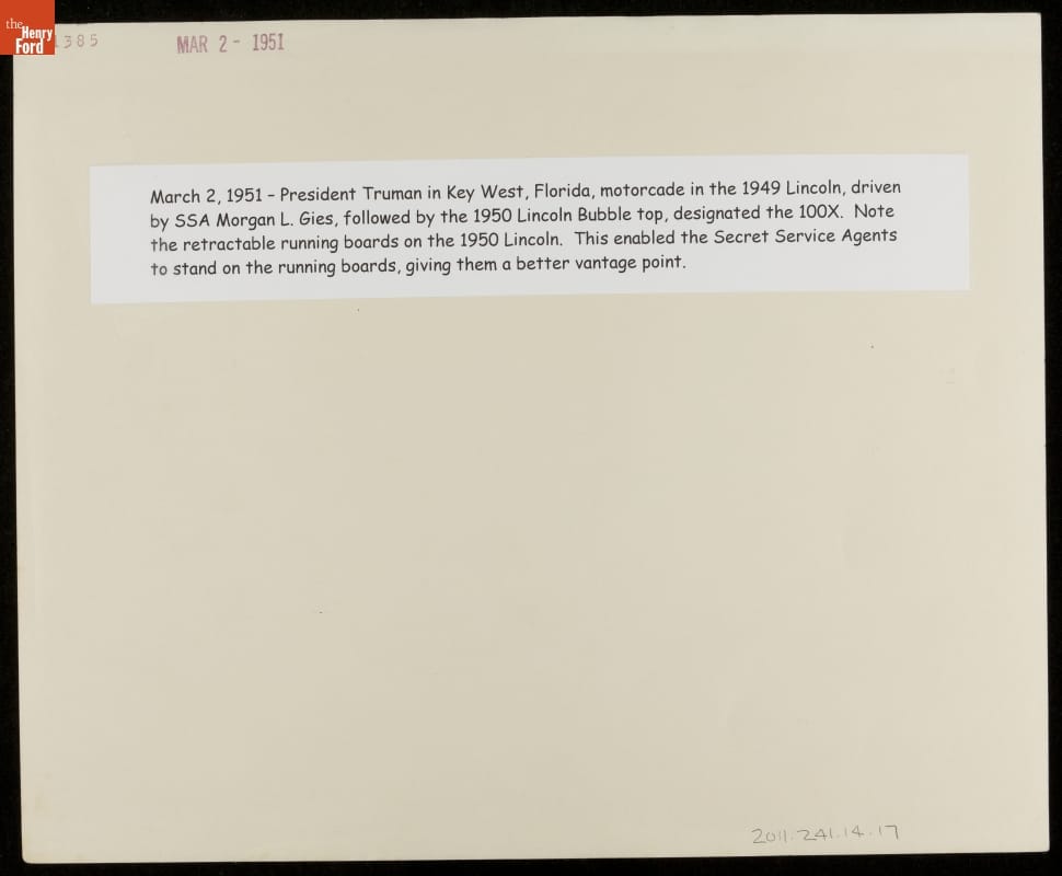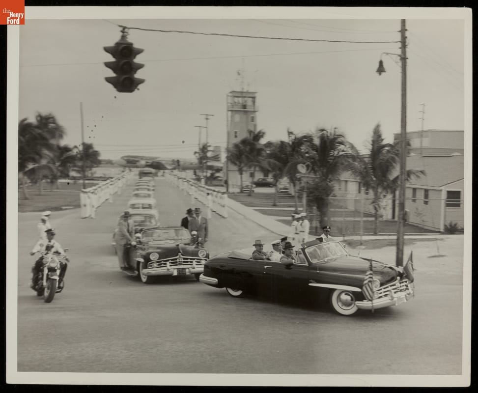 United States Secret Service agent Morgan L. Gies was responsible for White House vehicles from 1941 to 1967, serving five presidents. This photograph from his personal collection shows Gies leading a motorcade from behind the wheel of President Harry S. Truman's presidential convertible, a 1949 Lincoln Cosmopolitan. It was taken during Truman's 1952 vacation in Key West, Florida.