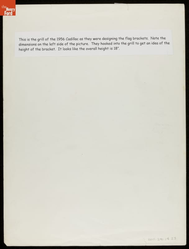 This is the grill [sic] of the 1956 Cadillac as they were designing the flag brackets. Note the dimensions on the left side of the picture. They hooked into the grill to get an idea of the height of the bracket. It looks like the overall height is 18".