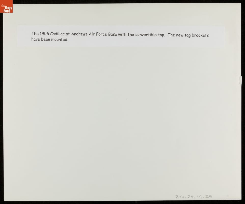 Typed caption affixed to back: The 1956 Cadillac at Andrews Air Force Base with the convertible top. The new tag [flag?] brackets have been mounted.