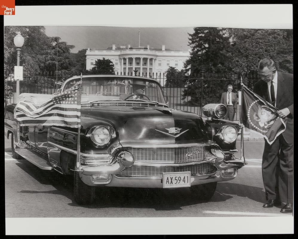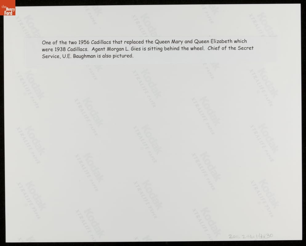 United States Secret Service agent Morgan L. Gies was responsible for White House vehicles from 1941 to 1967, serving five presidents. This photograph from his personal collection shows a 1956 Cadillac. Ohio company O'Gara-Hess and Eisenhardt custom-built two of these convertibles -- Queen Mary II and Queen Elizabeth II -- for presidential motorcade duty. They served Presidents Eisenhower, Kennedy, and Johnson.