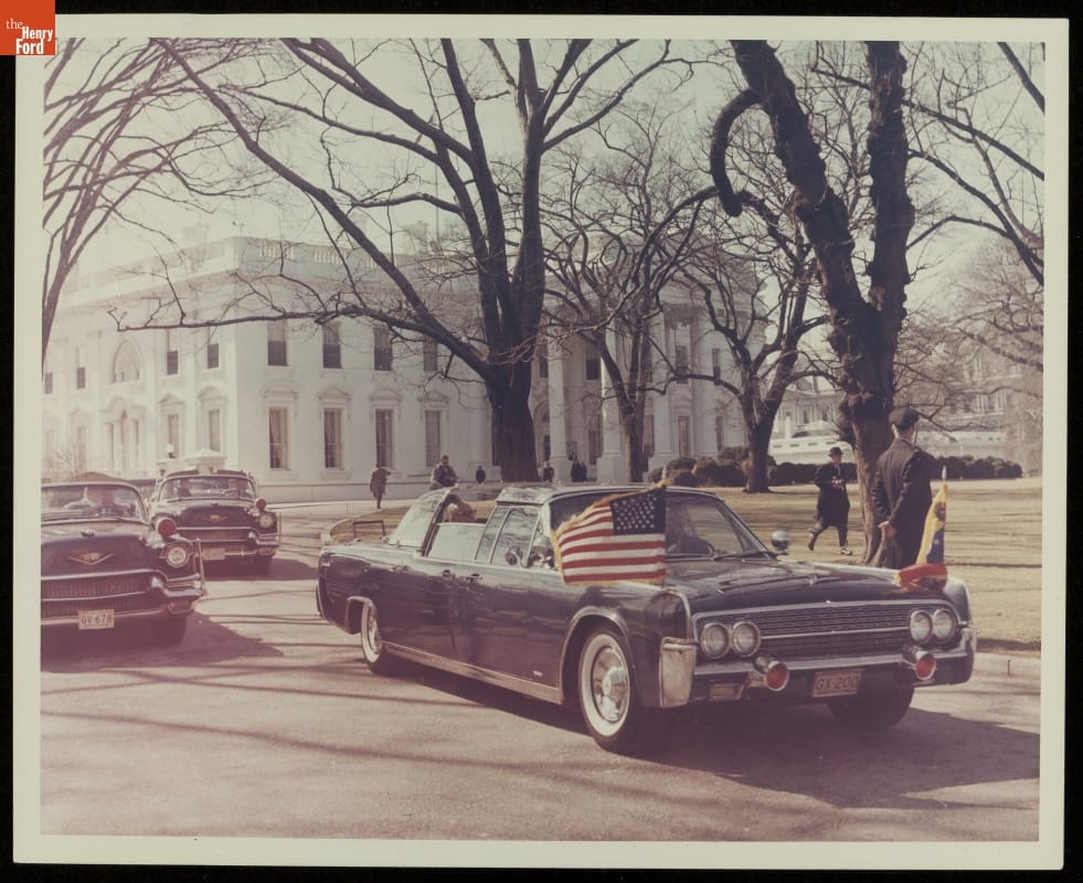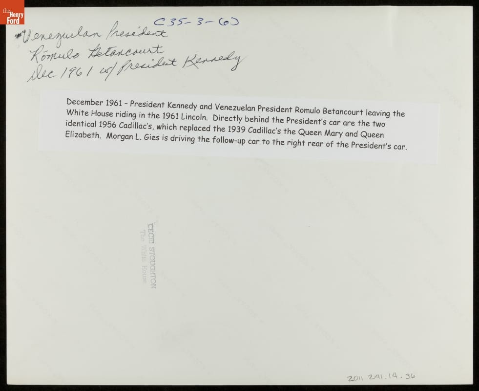 Type-written caption affixed to back: December 1961 - President Kennedy and Venezuelan President Romulo Betancourt leaving the White House riding in the 1961 Lincoln. Directly behind the President's car are the two identical 1956 Cadillac's [sic], which replaced the 1939 Cadillac's [sic] the Queen Mary and Queen Elizabeth. Morgan L. Gies is driving the follow-up car to the right rear of the President's car. Stamped on back: Cecil Stoughton The White House