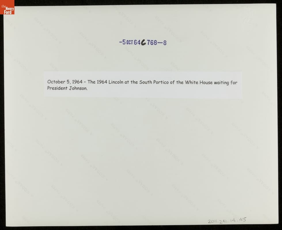 Type-written caption on back: October 5, 1964 - The 1964 Lincoln at the South Portico of the White House waiting for President Johnson. Stamped: -5 Oct 68 C 768-8