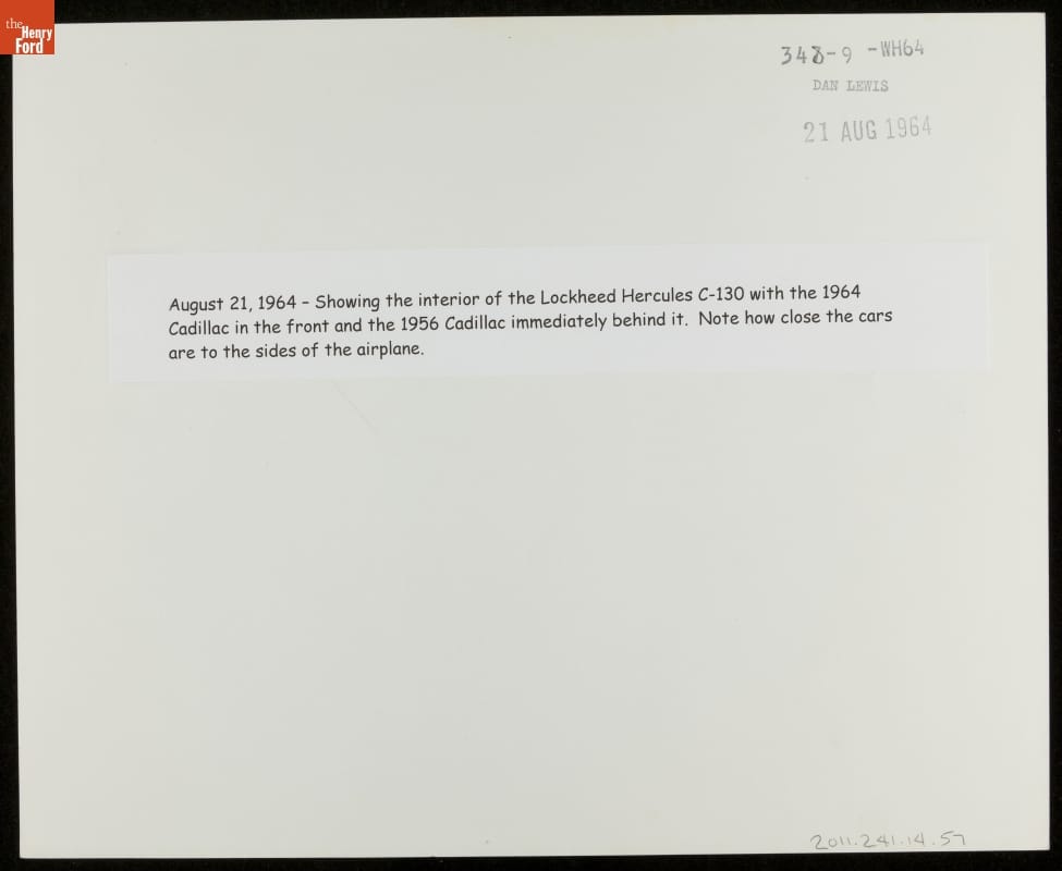 August 21, 1964 - Showing the interior of the Lockheed Hercules C-130 with the 1964 Cadillac in the front and the 1956 Cadillac immediately behind it. Note how close the cars are to the sides of the airplane.