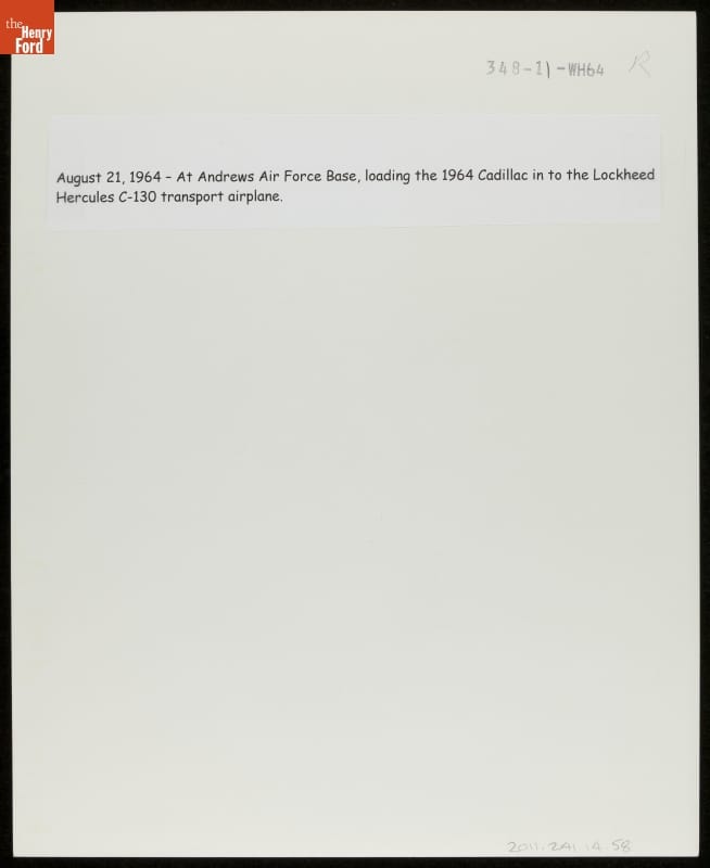 August 21, 1964 - At Andrews Air Force Base, loading the 1964 Cadillac in to the Lockheed Hercules C-130 transport airplane.
