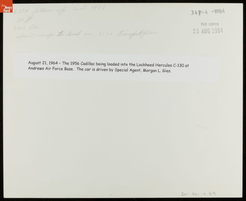 August 21, 1964 - The 1956 Cadillac being loaded into the Lockheed Hercules C-130 at Andrews Air Force Base. The car is being driven by Special Agent, Morgan L. Gies.