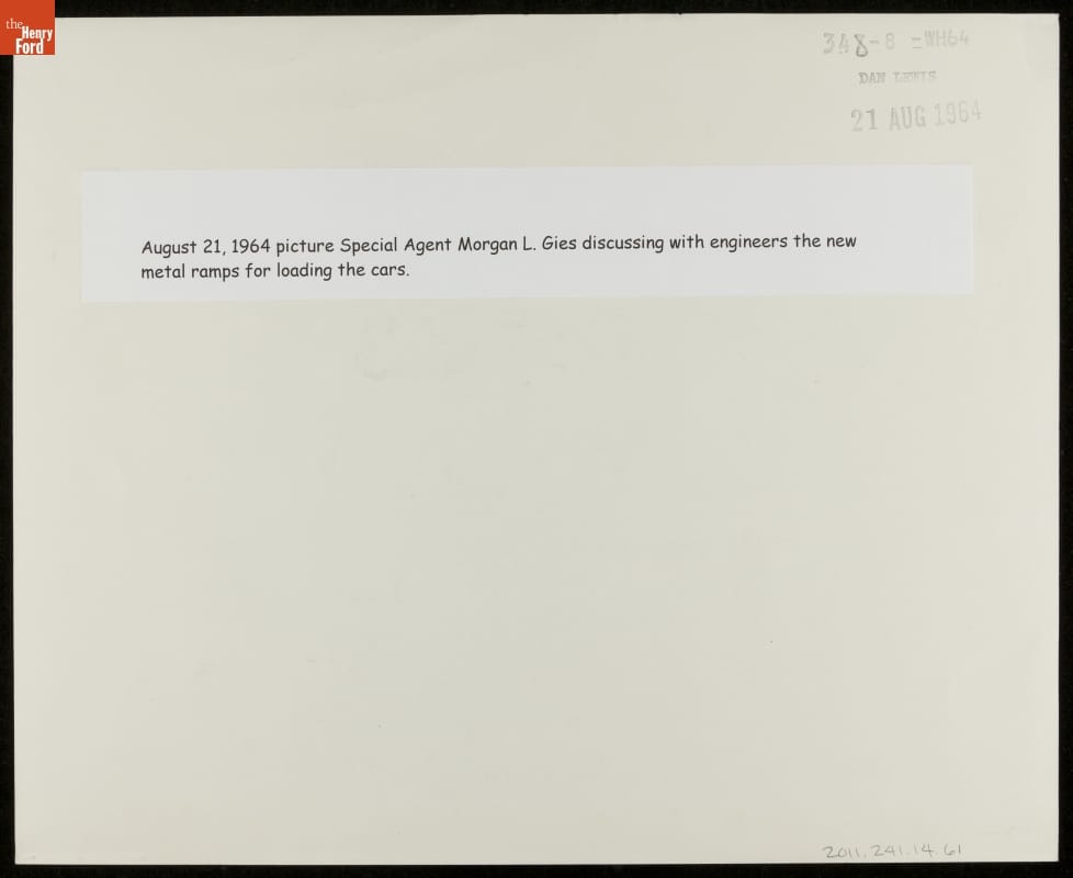 August 21, 1964 picture Special Agent Morgan L. Gies discussing with engineers the new metal ramps for loading the cars.