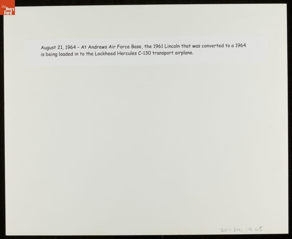 August 21, 1964 - At Andrews Air Force Base, the 1961 Lincoln that was converted to a 1964 is being loaded in to the Lockheed Hercules C-130 transport plane.