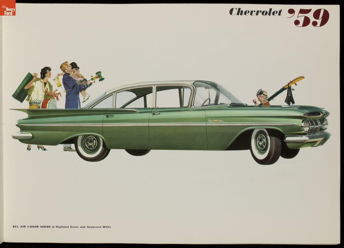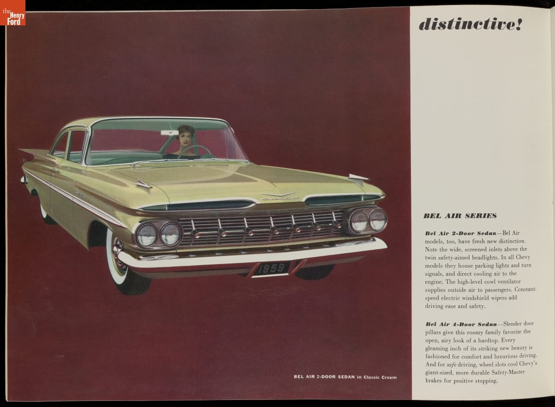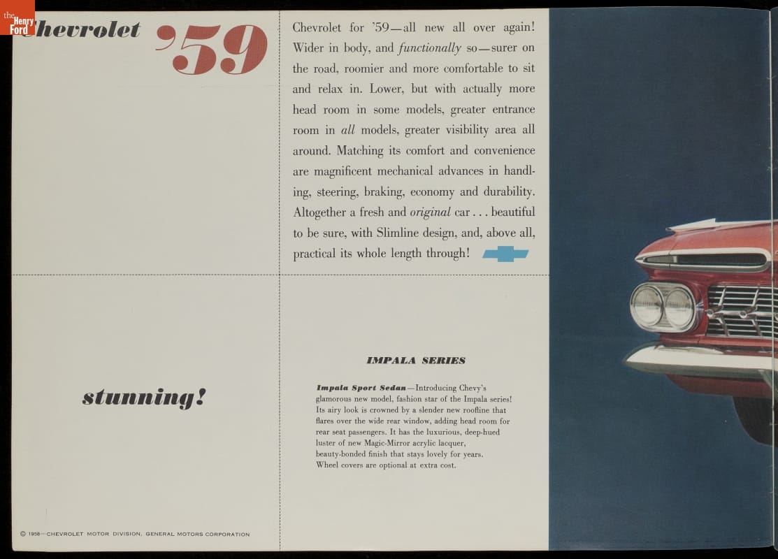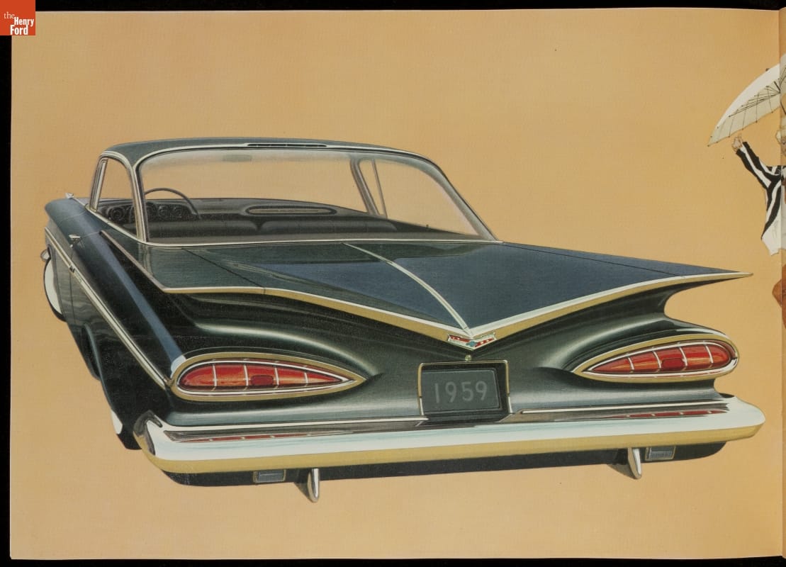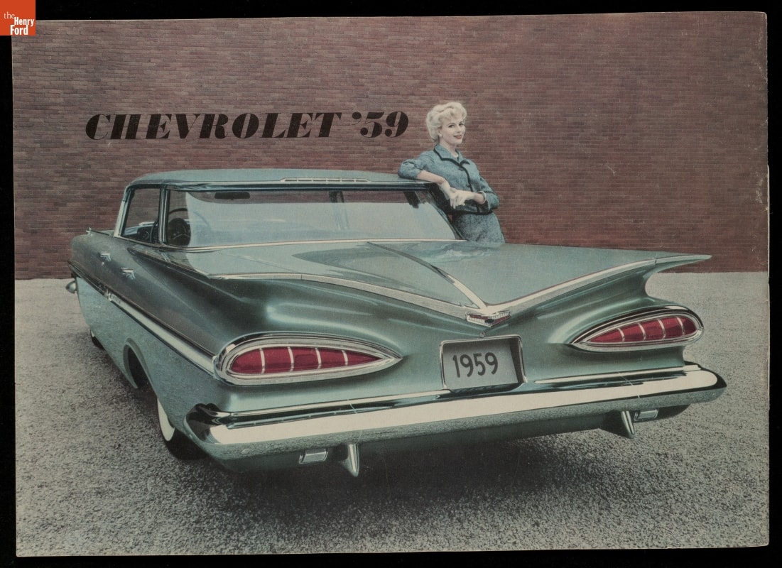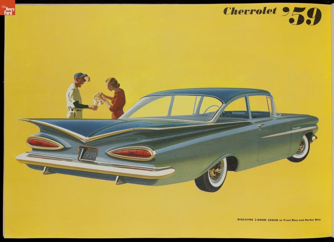 Chevrolet introduced wider, roomier bodies and new grilles on its 1959 cars, but the most dramatic styling updates were in back. "Spread wing" tailfins and cat's-eye taillights distinguished the automaker's Biscayne, Bel Air, and Impala models. "Magic-Mirror" lacquer and "Safety-Master" brakes debuted for 1959. Chevrolet's calendar year sales topped 1.5 million cars, and model year production surpassed 1.4 million.