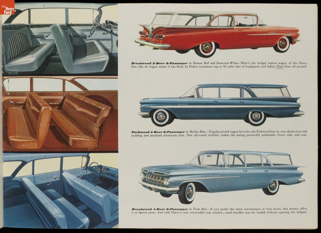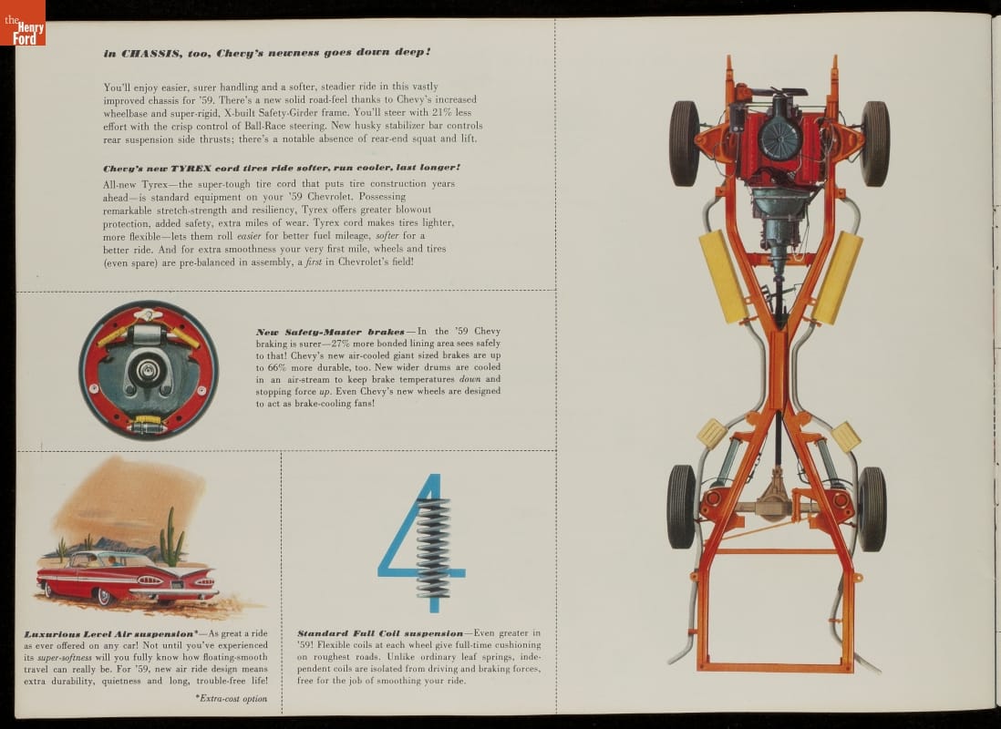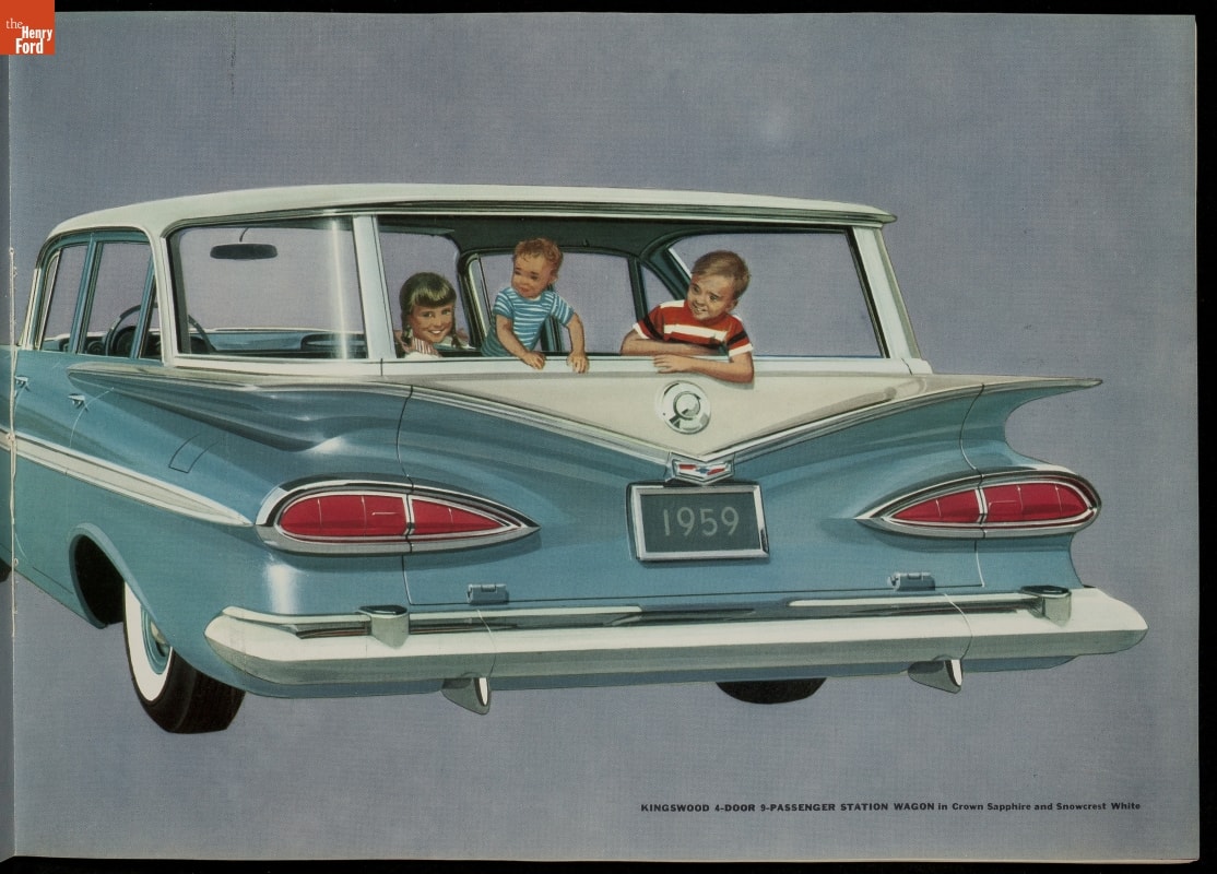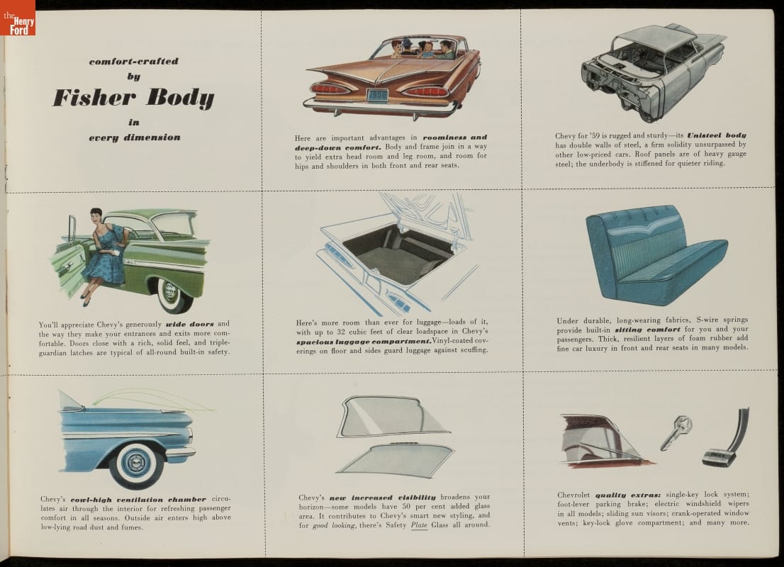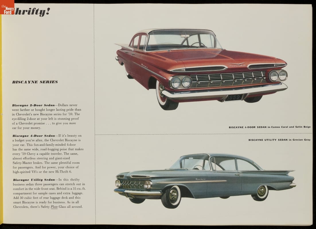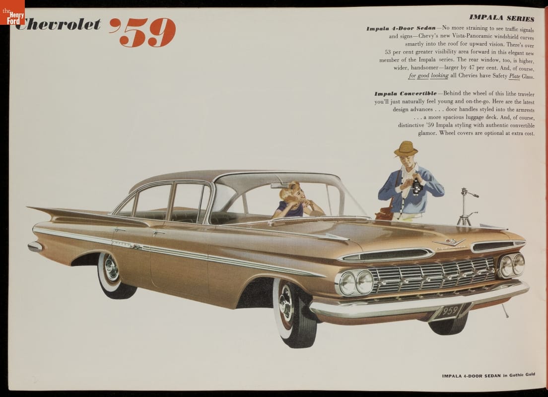 Chevrolet introduced wider, roomier bodies and new grilles on its 1959 cars, but the most dramatic styling updates were in back. "Spread wing" tailfins and cat's-eye taillights distinguished the automaker's Biscayne, Bel Air, and Impala models. "Magic-Mirror" lacquer and "Safety-Master" brakes debuted for 1959. Chevrolet's calendar year sales topped 1.5 million cars, and model year production surpassed 1.4 million.