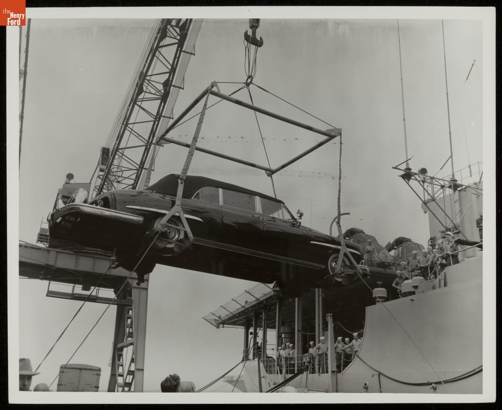 Loading the 1950 Lincoln "Bubble-Top" Presidential Automobile onto the USS Taconic, March 1957
