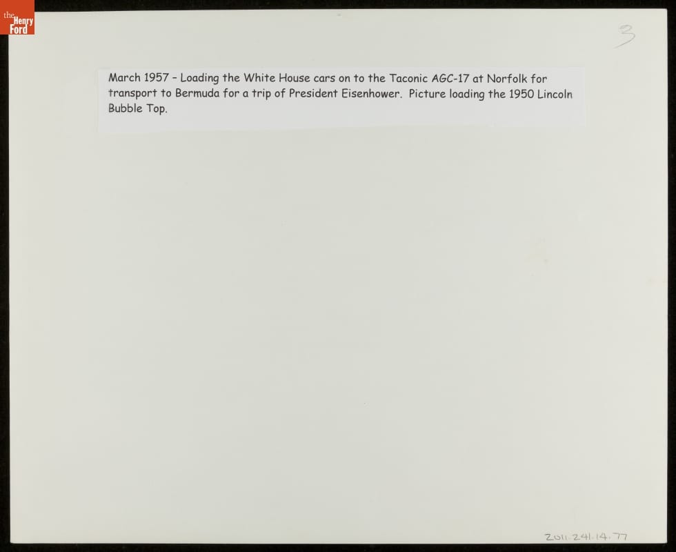 When the President travels abroad, United States Secret Service agents ensure that state cars arrive ahead of him. In this photograph, USS Taconic takes on President Dwight D. Eisenhower's "Bubble-top" limousine for a visit in Bermuda with British Prime Minister Harold MacMillan. The Secret Service began using transport aircraft to carry presidential vehicles around 1960.