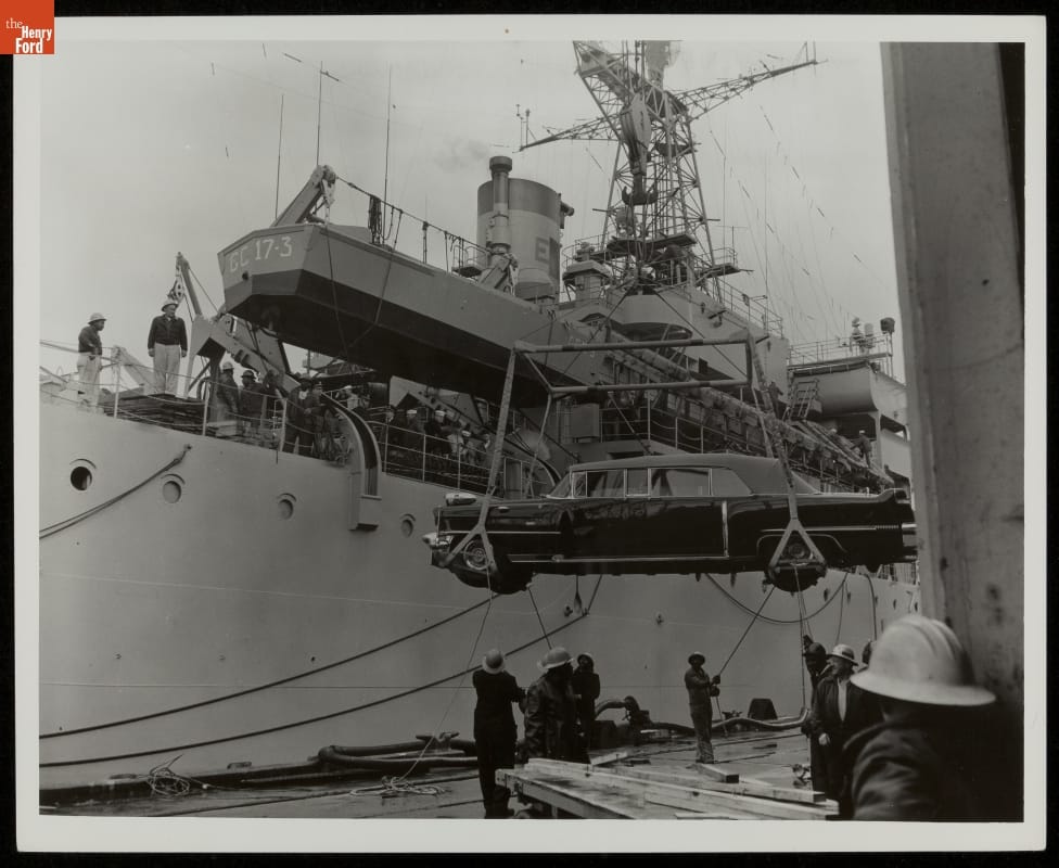 When the President travels abroad, United States Secret Service agents ensure that state cars arrive ahead of him. In this photograph, USS Taconic takes on President Dwight D. Eisenhower's Cadillac for a visit in Bermuda with British Prime Minister Harold MacMillan. The Secret Service began using transport aircraft to carry presidential vehicles a few years later.