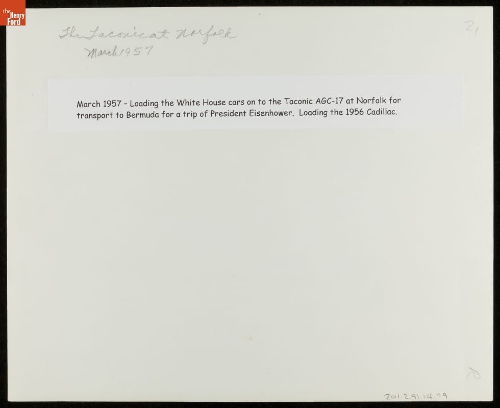 March 1957 - Loading the White House cars on to the Taconic AGC-17 at Norfolk for transport to Bermuda for a trip of President Eisenhower. Loading the 1956 Cadillac.