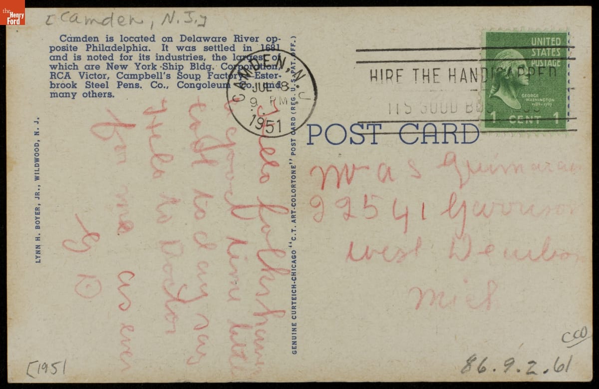Text printed on back: Camden is located on Delaware River opposite / Philadelphia / ... noted for industries...