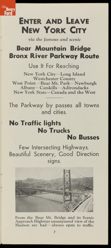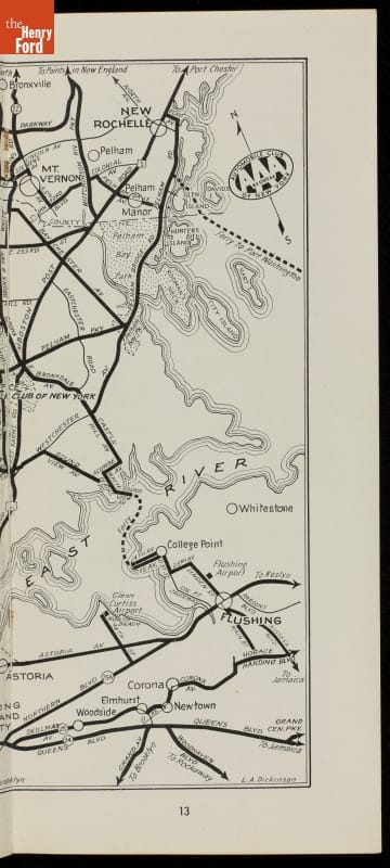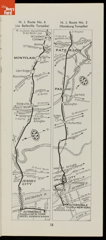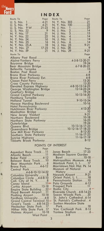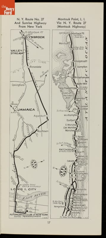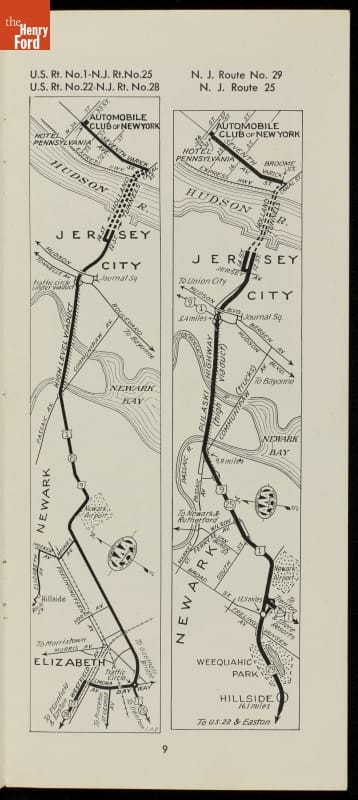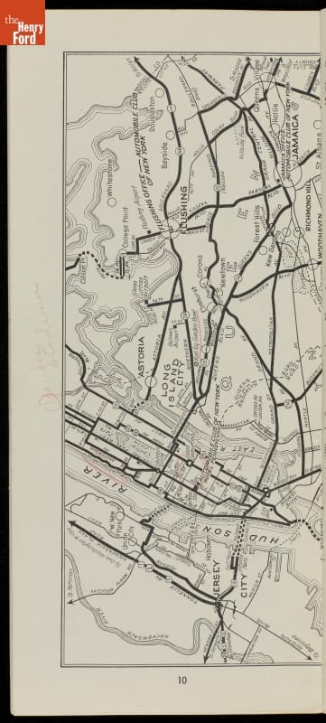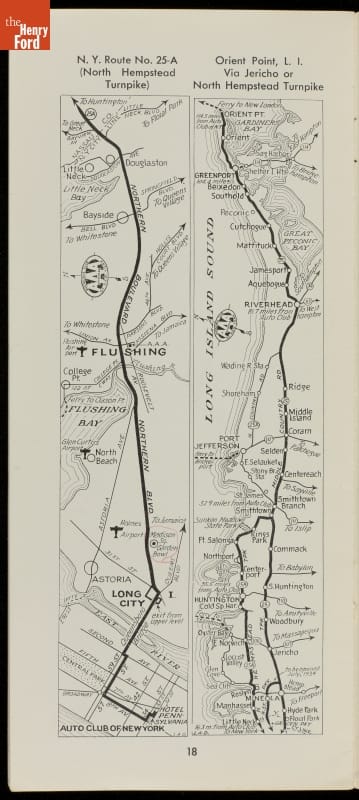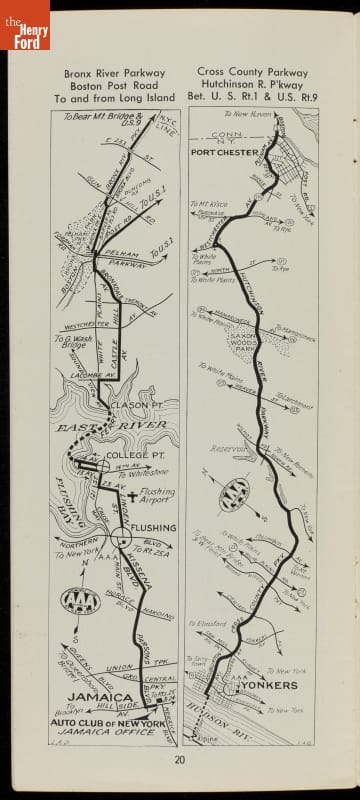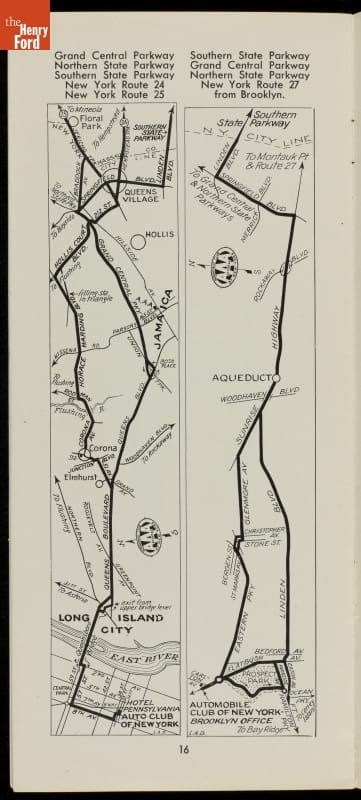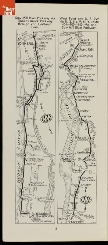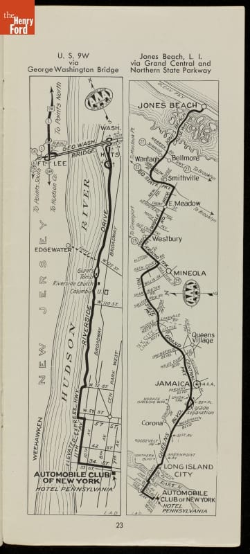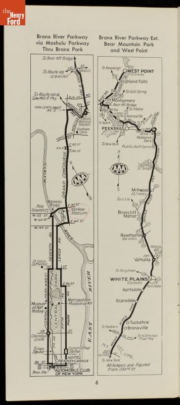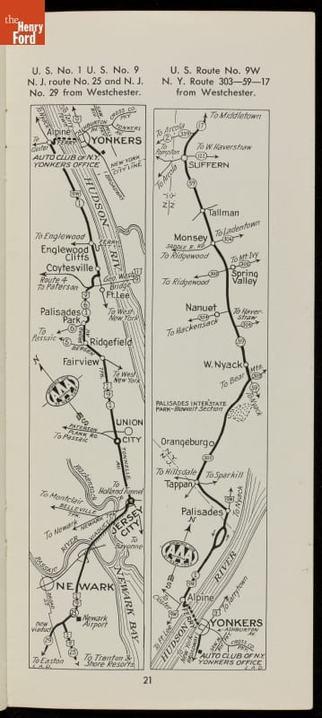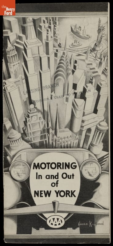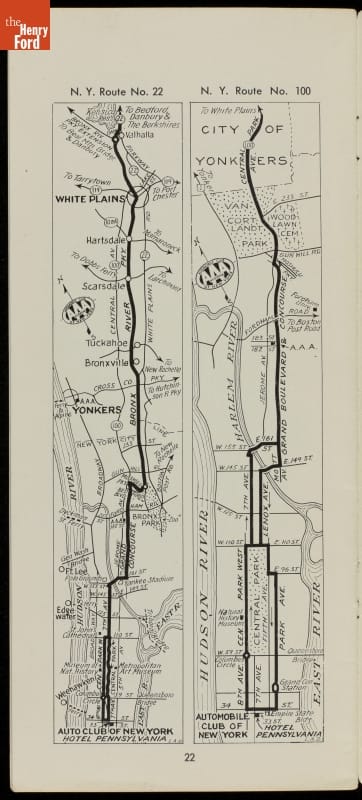 AAA has long been known for its road maps. Roads were so poorly marked in the early years of motoring that maps had to include detailed written instructions or photographs of landmarks with arrows superimposed on them. As roads improved--and with the addition of identifiable highway names and numbers--road maps became easier to follow. This detailed 1934 book of maps to and from New York City came from the Lansing Branch of AAA Michigan.