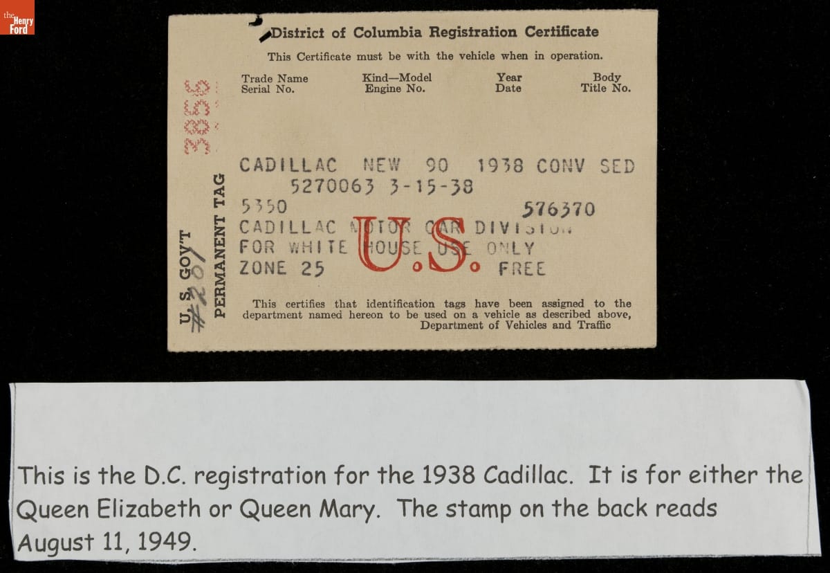 United States Secret Service agent Morgan L. Gies was responsible for White House vehicles from 1941 to 1967, serving five presidents. He retained this 1949 registration certificate for either Queen Mary or Queen Elizabeth--1938 Cadillac motorcade convertibles used by Secret Service agents under Presidents Roosevelt, Truman, and Eisenhower.