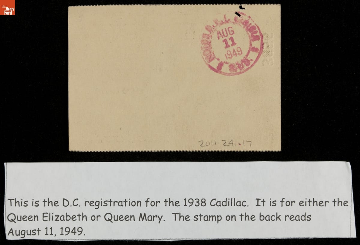This is the D.C. registration for the 1938 Cadillac. It is for either the Queen Elizabeth or Queen Mary. The stamp on the back reads August 11, 1949.