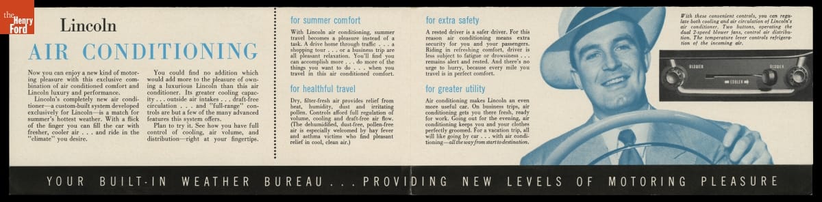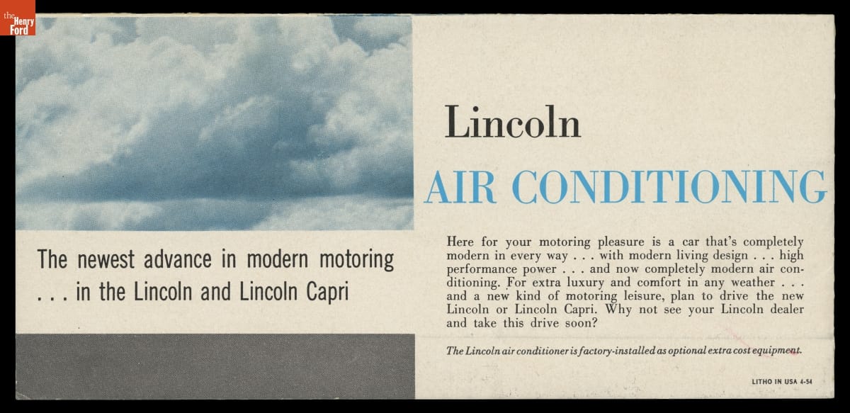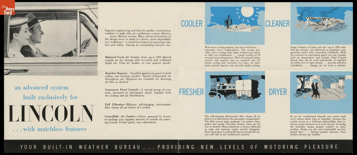 Air conditioning first appeared on Lincoln's options list in the 1955 model year. The unit was mounted in the trunk, with fresh air intakes on the rear fenders and cabin vents built into the ceiling. Lincoln listed the system's many benefits in this brochure, including cleaner cabin air, reduced humidity on damp days, and less tiring conditions for the driver.