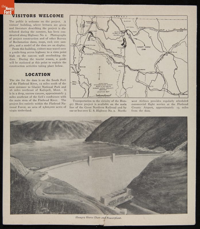 The Bureau of Reclamation created this brochure touting the benefits of constructing the Hungry Horse Dam on the South Fork Flathead River in northwest Montana. According to the Bureau, the dam would produce low-cost power, stimulate the area's economy, provide farm irrigation, and control potential floodwaters. Construction started in 1948, and the dam was completed five years later in 1953.