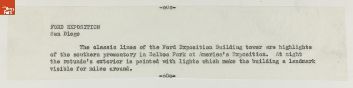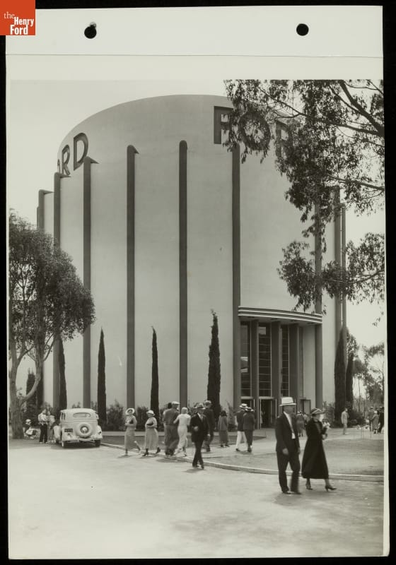 Resembling two engaged gears, Ford's steel, concrete, and glass exhibition building towered above more traditional structures at the 1935 California Pacific International Exposition. The Ford Building -- created in the "Streamline Moderne" architectural style by industrial design pioneer Walter Dorwin Teague -- combined clean curves and sharp lines with modern materials, reflecting technological progress in the new machine age.